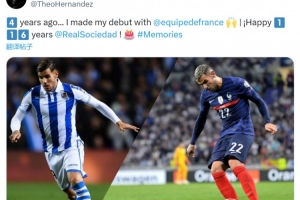 特奥社媒晒出自己身穿法国队和皇家社会球衣的照片,配文:“4年前的今天,我在法国队上演首秀。祝皇家社会116岁生日快乐!”