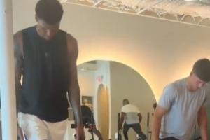 小贾巴里-史密斯、谢泼德、杰夫-格林一同练瑜伽,练习柔韧度平衡感和呼吸。