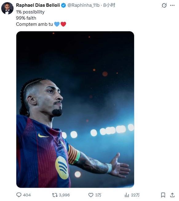 拉菲尼亚在社交平台上晒出了这句话,并用加泰罗尼亚语补充道:“Comptem amb tu”(我们依靠你),这是对球迷的呼唤,希望他们成为第12名球员,助力巴萨实现逆转。
